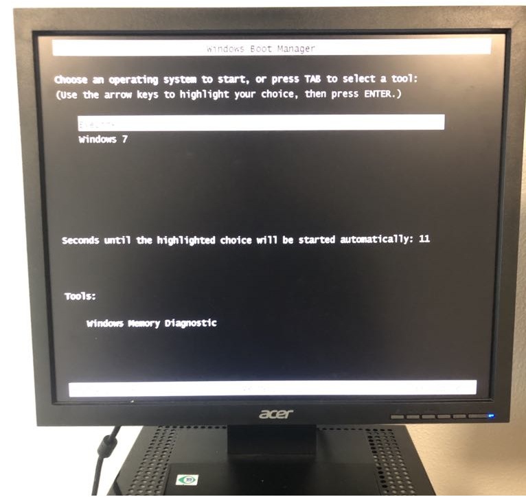 The Eyelink 1000 eye tracker pc is located just to the left of the stimulus pc and has its own pc and monitor. Once turned on you can select to run the Eyelink 1000 or a Windows 7 setup:
