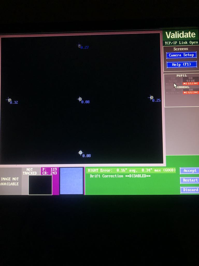Now to validate the calibration you should press the v key which will do the exact same procedure. Once finished you will find that the eyetracking pc will display the accuracy of the calibration.