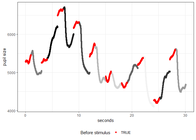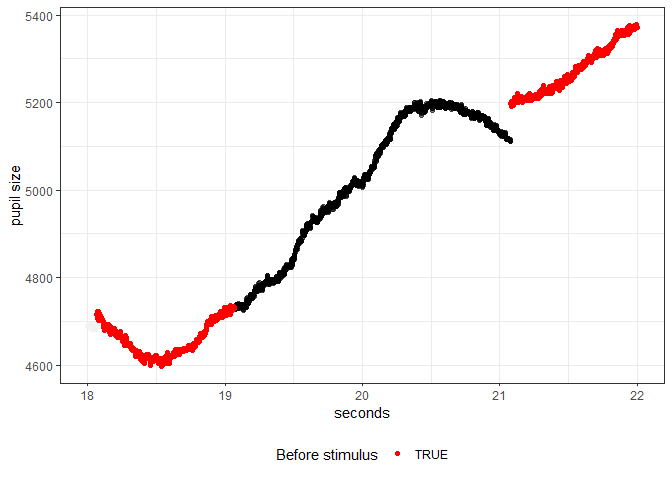 We here see that at 21 seconds there is a jump in pupil size from one trial to the next. This happens because we are not continuously recording the pupil size (and gaze) we only record in a section before the stimulus (1 second here) and then for the duration of the stimulus (2 seconds here). This means that the interval around 21 seconds in the plot above was not continuously recorded and there might be several seconds between the black and red line when the experiment is running. The reason for doing this is to reduce the space required to store the eyetracking files as we get 1000 rows per second (sampling rate of 1000Hz) which can quickly add up in memory.