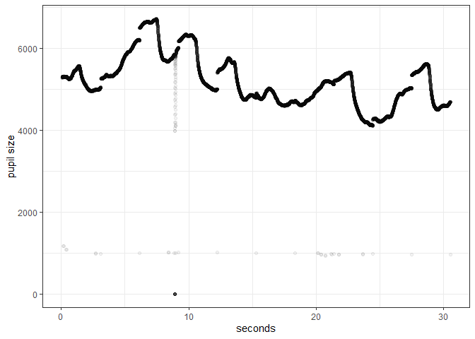 Here we see some quite reasonable raw pupilometry data. What one should here focus on are the dots where the pupil size is around 1000 which is scattered in time. These are points where there the eye is partly closed and the eye tracker can’t find the eye.